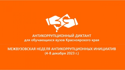 06декабря В Красноярском крае состоялся антикоррупционный диктант для обучающихся высших учебных заведений 5 декабря 2023 года в рамках Межвузовской недели антикоррупционных инициатив состоялся антикоррупционный диктант. Участниками антикоррупционного диктанта стали обучающиеся восьми высших учебных заведений, находящихся на территории Красноярского края.