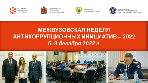 30ноября В Красноярском крае пройдет первая Межвузовская неделя антикоррупционных инициатив В период с 5 по 9 декабря 2022 г. студентов краевых образовательных организаций ожидает уникальное информационно-просветительское событие — Межвузовская неделя антикоррупционных инициатив, организаторами которой выступают Сибирский федеральный университет, Администрация Губернатора Красноярского края, Прокуратура Красноярского края, Красноярское региональное отделение Ассоциации юристов России, межвузовская комиссия по профилактике коррупции при Совете ректоров вузов Красноярского края. Мероприятия недели приурочены к празднованию Международного дня борьбы с коррупцией.